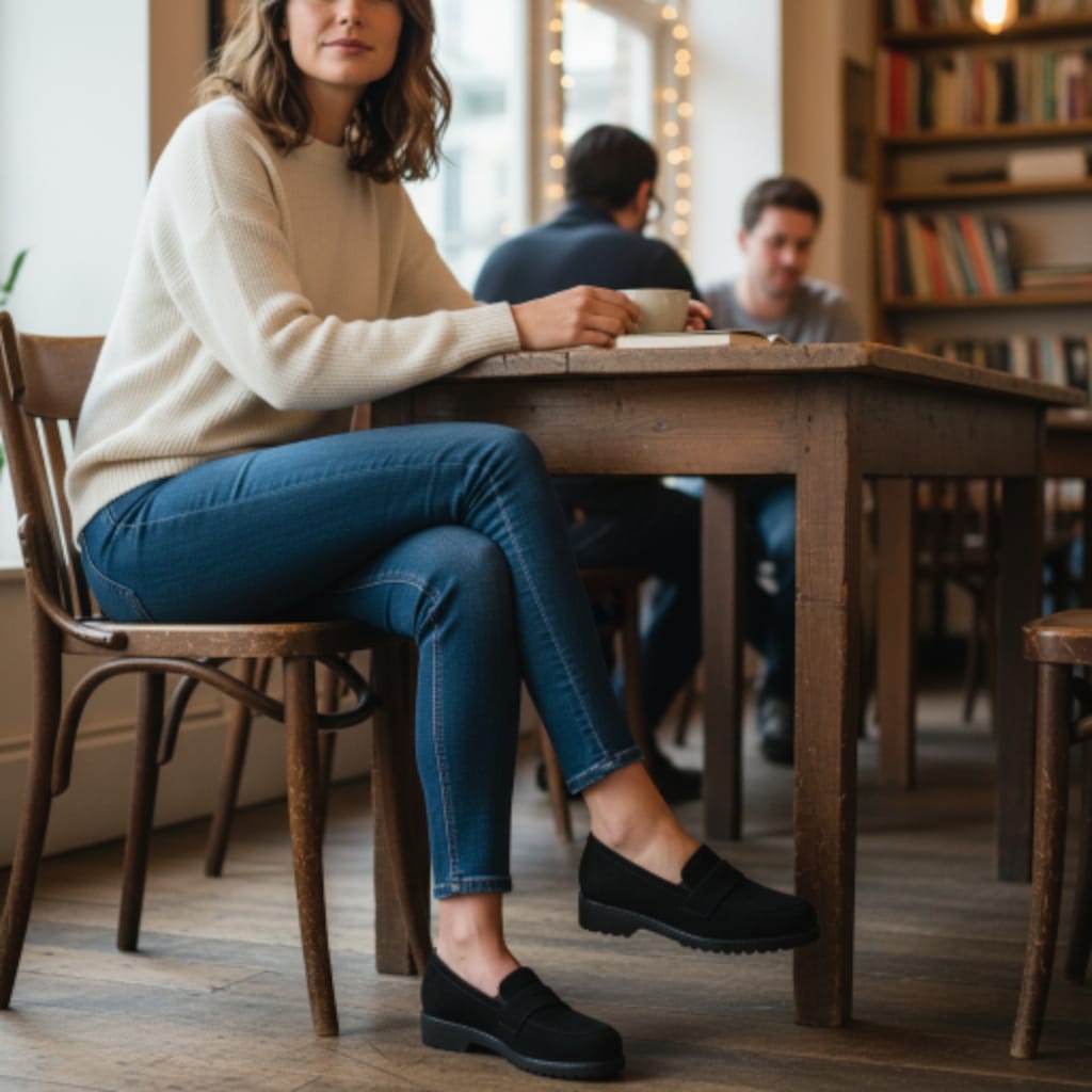 Queste scarpe accollate in camoscio nero presentano una finitura che conferisce un aspetto elegante e sofisticato. La montatura è realizzata in materiale di alta qualità, mentre la suola robusta offre comfort e stabilità. I dettagli sulla parte superiore aggiungono un tocco di stile, rendendo queste scarpe adatte per occasioni formali e casual. Il design classico assicura una vestibilità perfetta. Ideali per un look moderno e raffinato. La scarpa ha il plantare estraibile che la rende adatta all'inserimento di plantari ortopedici.