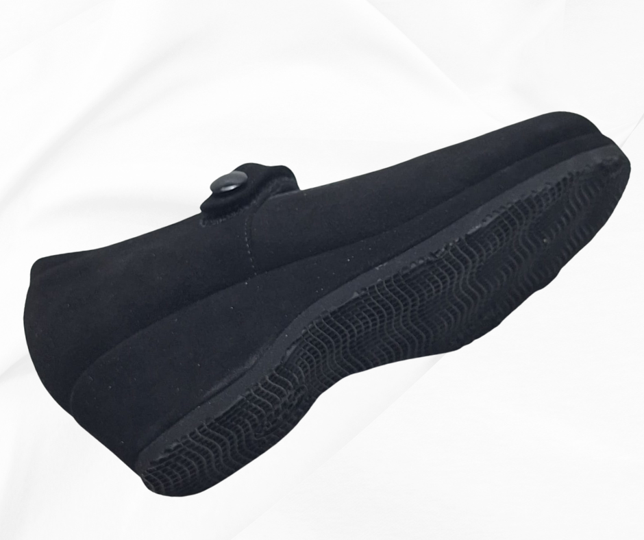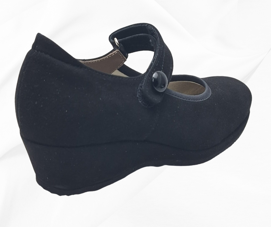 Queste eleganti scarpe Mary Jane presentano una tomaia in suede grigio, caratterizzata da una finitura morbida al tatto. La forma arrotondata delle punte e il tacco a zeppa offrono comfort e stile, rendendole ideali per occasioni formali e casual. La fascetta nera lucida aggiunge un tocco di contrasto e raffinatezza, mentre la chiusura con bottone garantisce una vestibilità sicura. Perfette per un look vintage o moderno, queste scarpe sono un must-have per ogni guardaroba. E' una calzatura predisposta per plantari ortopedici